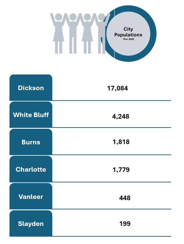 Recent figures released by Esri show the unemployment rate in Dickson County down to around 3.0%. Dickson County’s economic growth over the last several years has also impacted the surrounding counties. Serving as the main commercial center west of Nashville, Dickson County businesses pull from nearby areas for a consistent supply of customers and clients as well as employees.