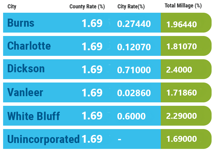 Dickson County, Tennessee has fair taxes, which make the county an equitable place for businesses and employees to thrive. Every assessed property is subject to the 2.35 millage rate for the county, while additional millage rates apply to properties within the confines of the six incorporated municipalities within the county. Property assessment ratios vary by property type. A portion of county property taxes are directed to fund public K-12 education in Dickson County.